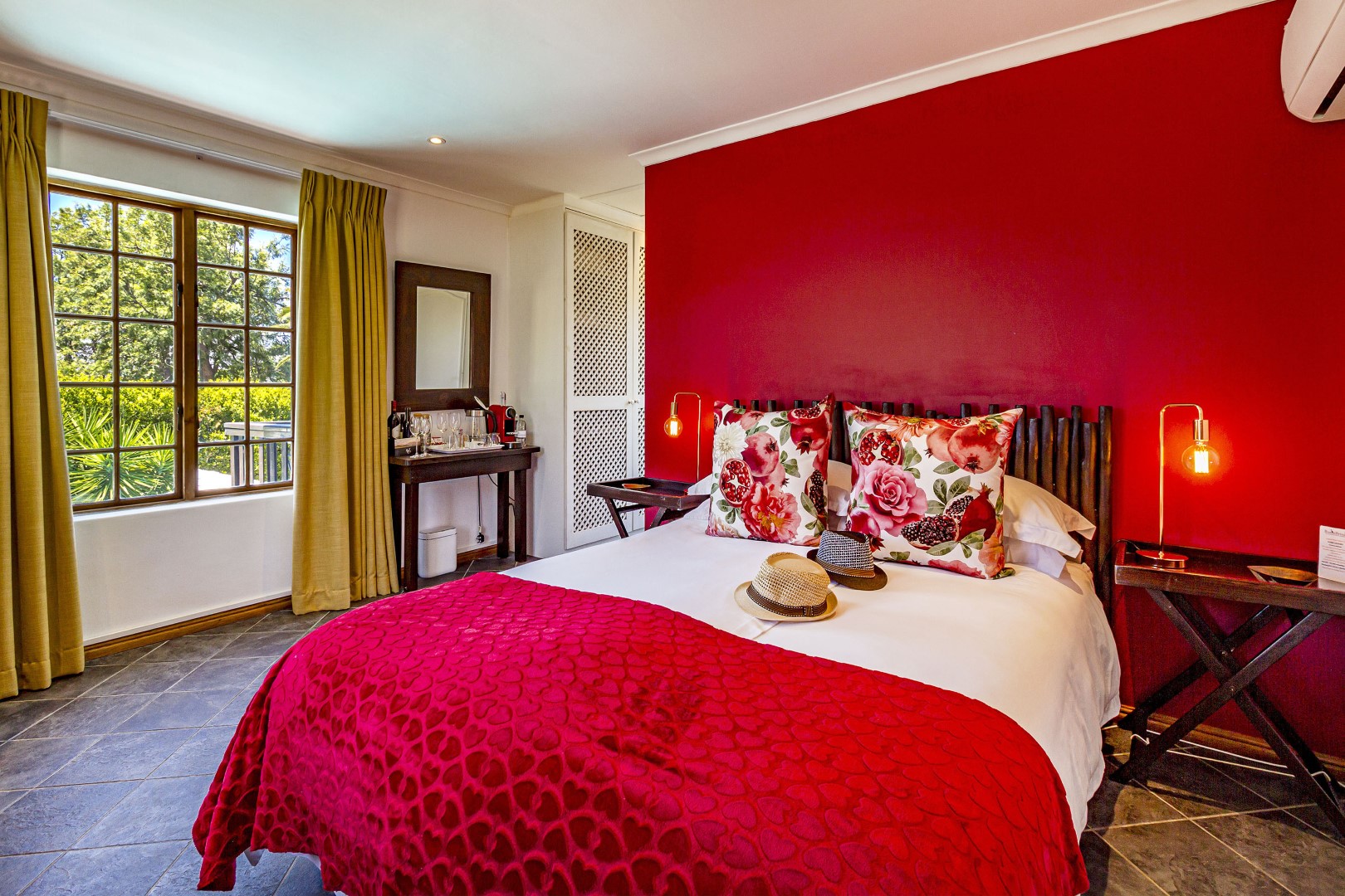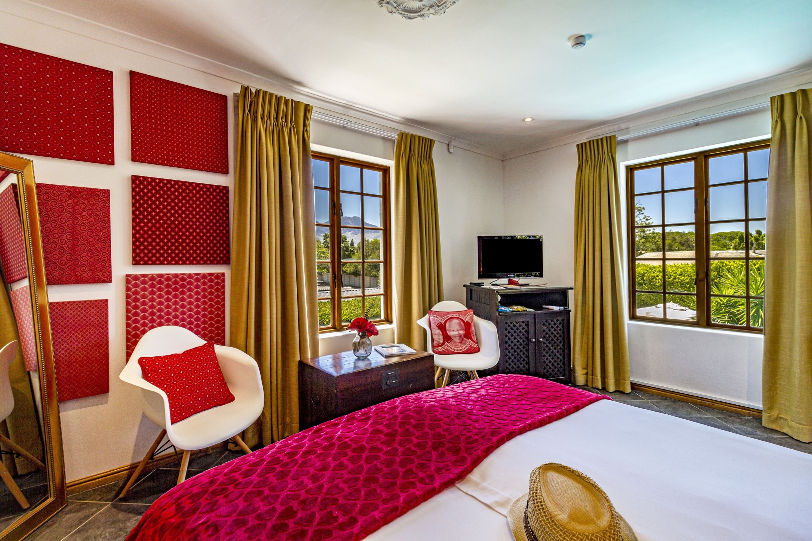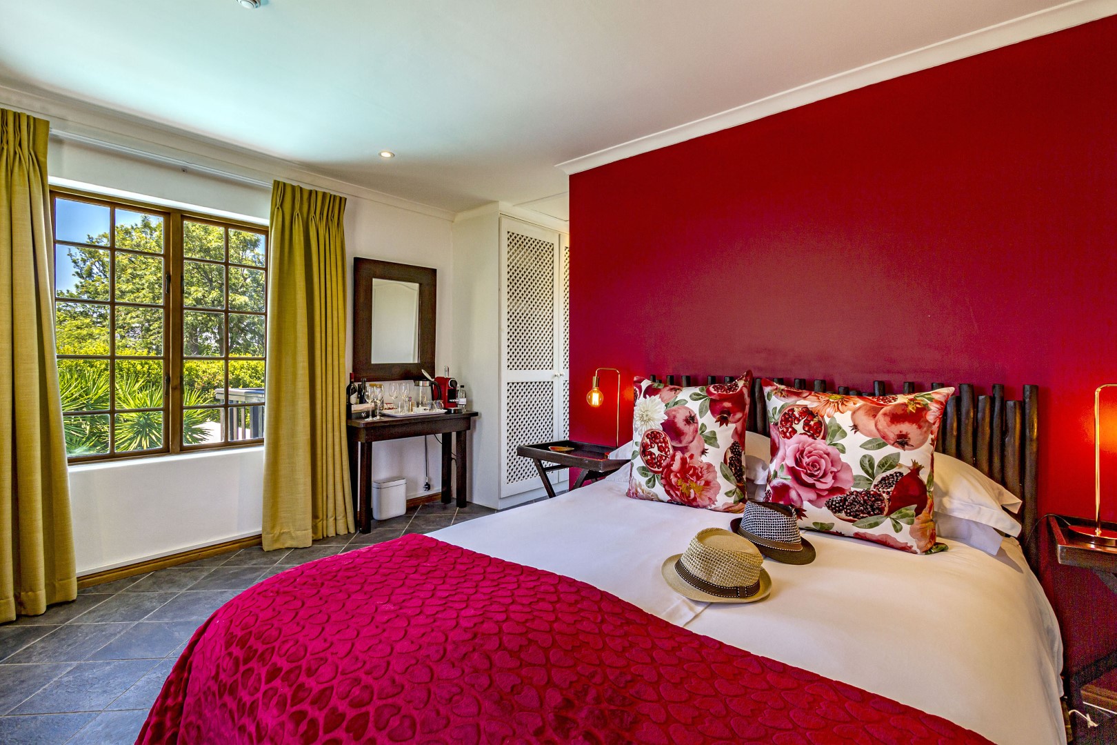 Vom Bellevue Zimmer geniessen Sie die wunderschöne Aussicht auf den umliegenden Helderberg und unsere Pool Landschaft. Das Zimmer hat eine Verbindungstür zum blauen Zimmer. Ideal für Familien / Freunde, die nebeneinander wohnen möchten.