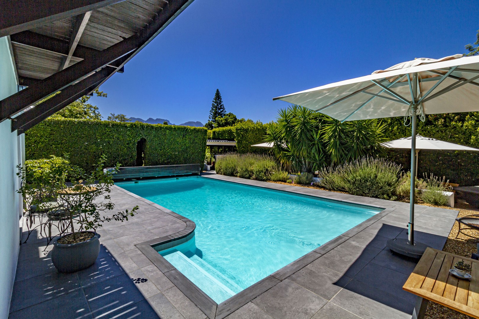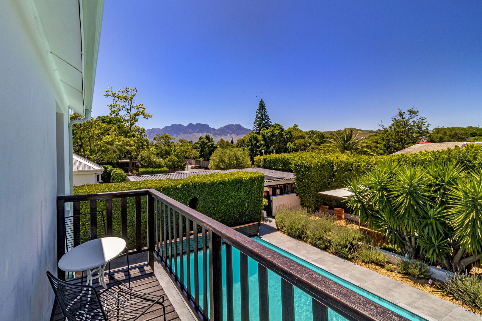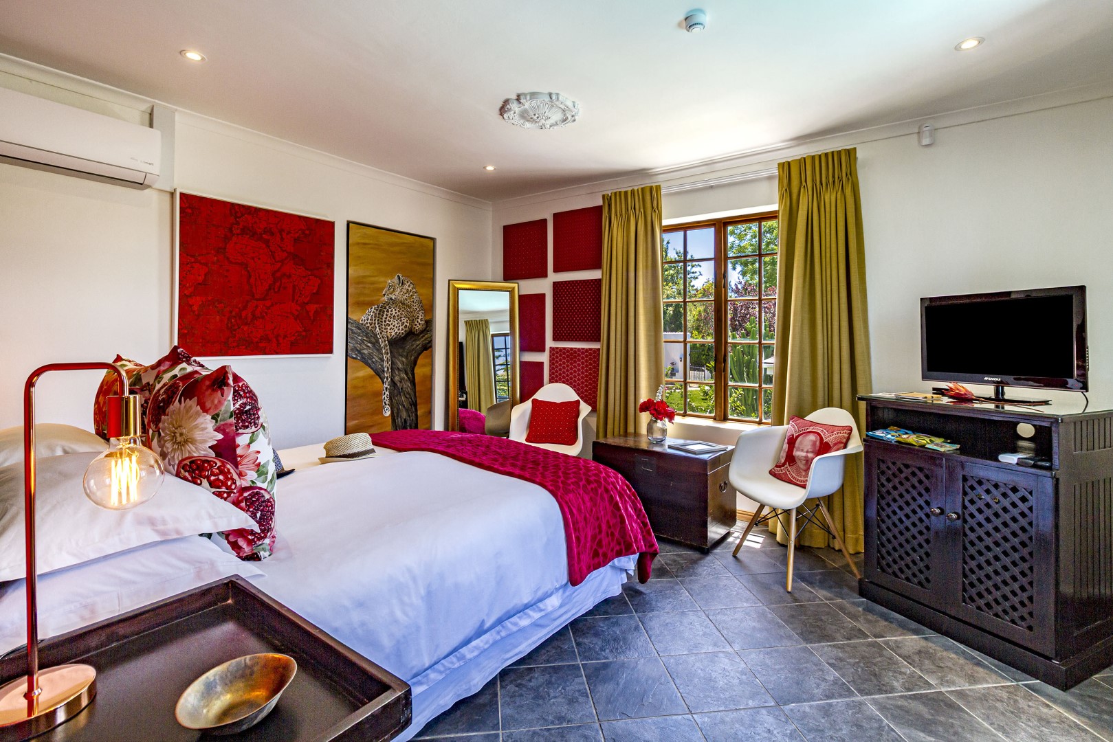 Vom Bellevue Zimmer geniessen Sie die wunderschöne Aussicht auf den umliegenden Helderberg und unsere Pool Landschaft. Das Zimmer hat eine Verbindungstür zum blauen Zimmer. Ideal für Familien / Freunde, die nebeneinander wohnen möchten.