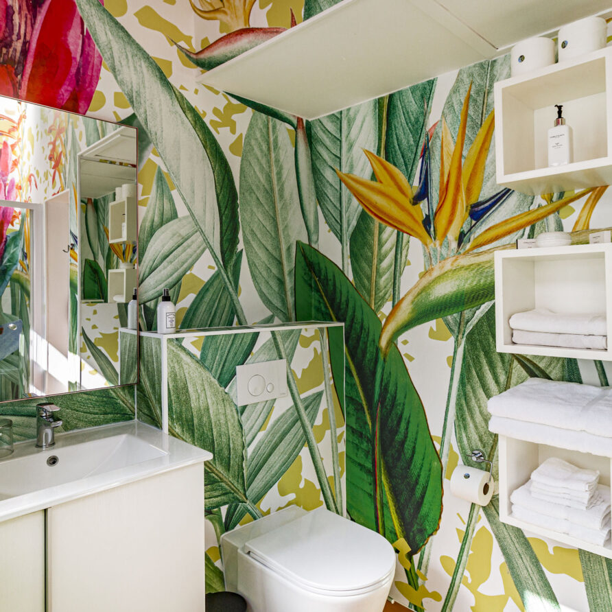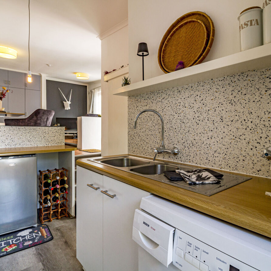 Das Maisonette Häuschen verfügt über eine Essecke und einen Wohnbereich mit Sofa. Es hat eine eigene Terrasse mit Tisch, Stühlen, sowie Sonnenliegen und bietet mit der integrierten Küche und Waschmaschine eine ideale Wahl für längere Aufenthalte. Das Bad ist grosszügig gestaltet, mit Dusche und WC.