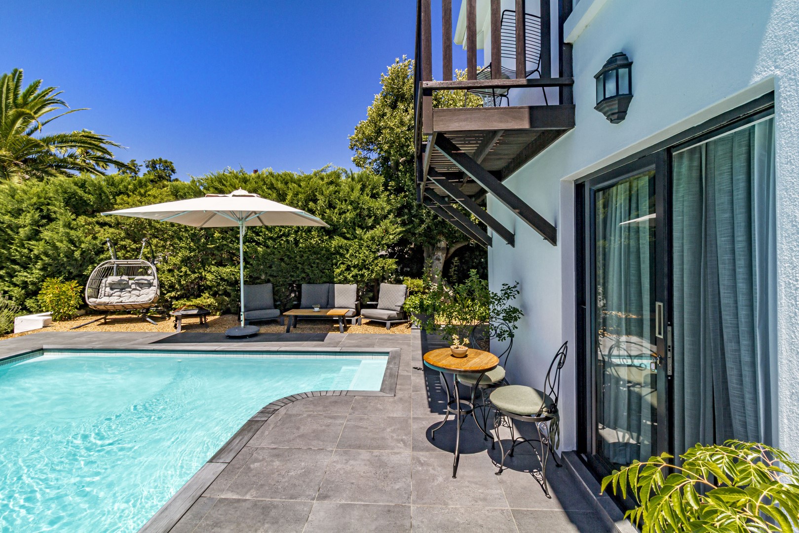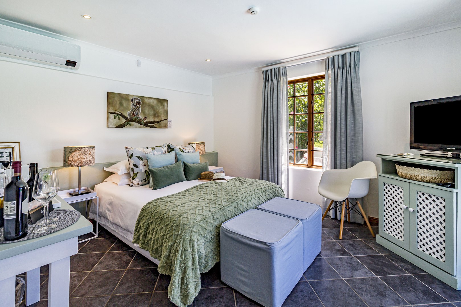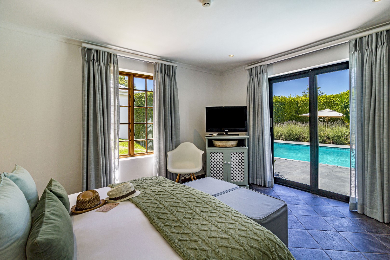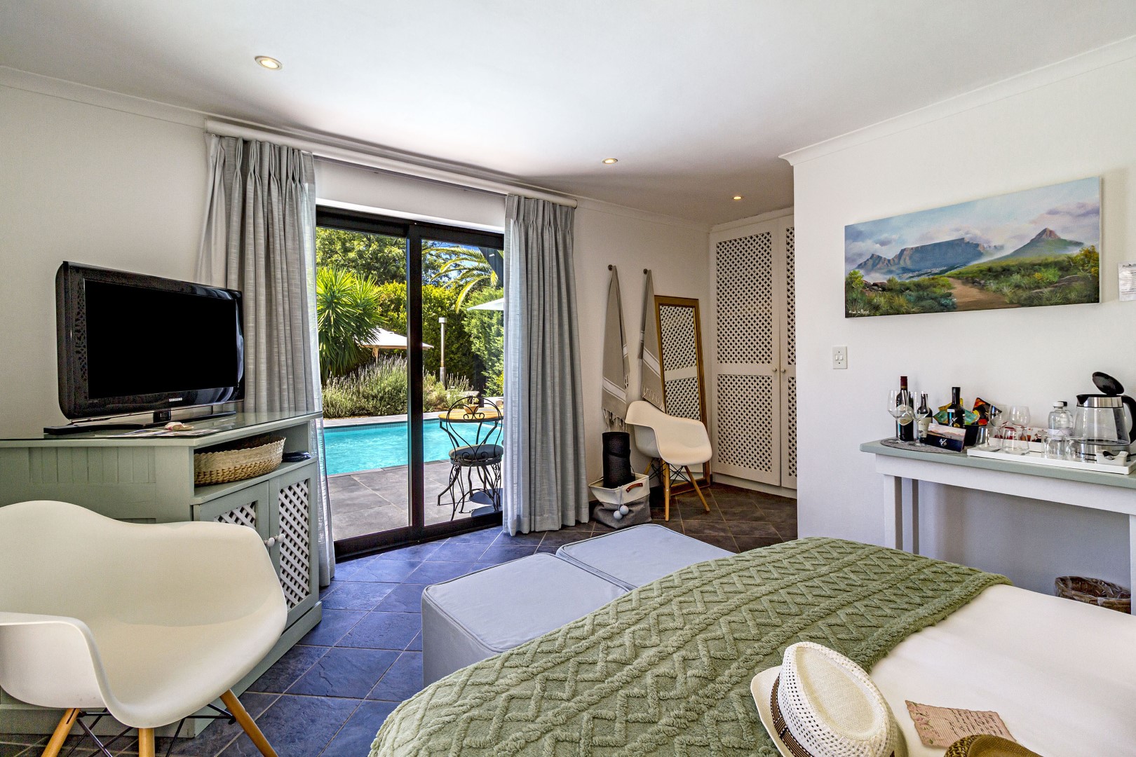 Das Pool Zimmer befindet sich in direkter Pool Nähe. Vom Doppelbett aus geniessen Sie den direkten Blick zum Pool, Wasser und den Palmen. Das Pool Zimmer ist in der Farbe lindgrün gehalten. Vor dem Pool Zimmer befindet sich ein Tisch mit Stühlen zum Verweilen.